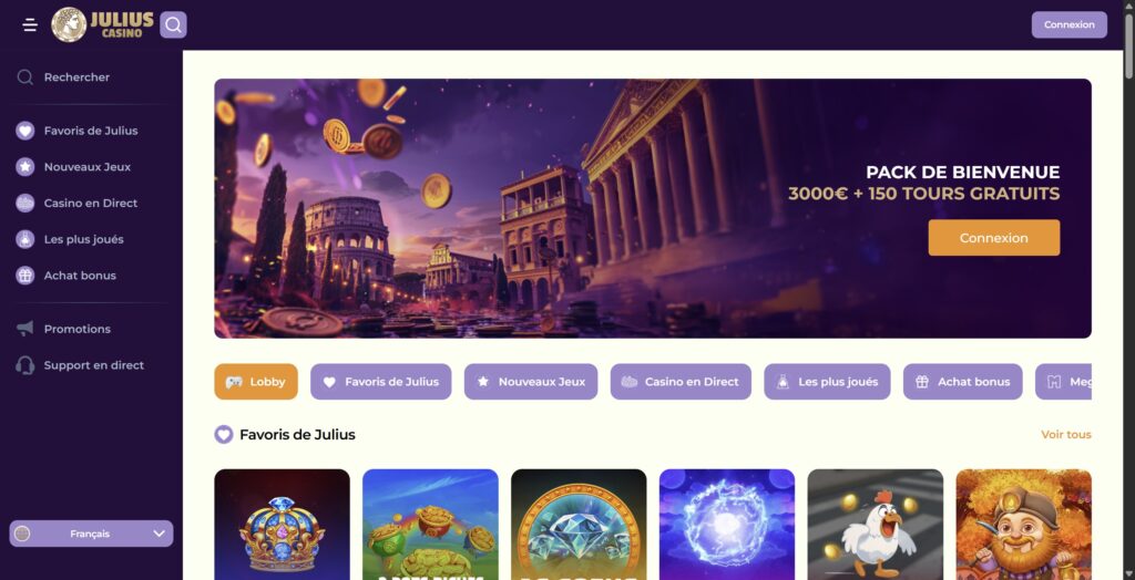 Avec NetEnt, Play’n GO et Evolution Gaming, Julius Casino offre des classiques (Roulette, Blackjack) et des exclusivités. Le Live Casino inclut Crazy Time et Monopoly Live, avec diffusion multi-angle. Les mini-jeux comme Aviator s’adressent aux adeptes de rapidité. Une application mobile est attendue pour une accessibilité optimale.