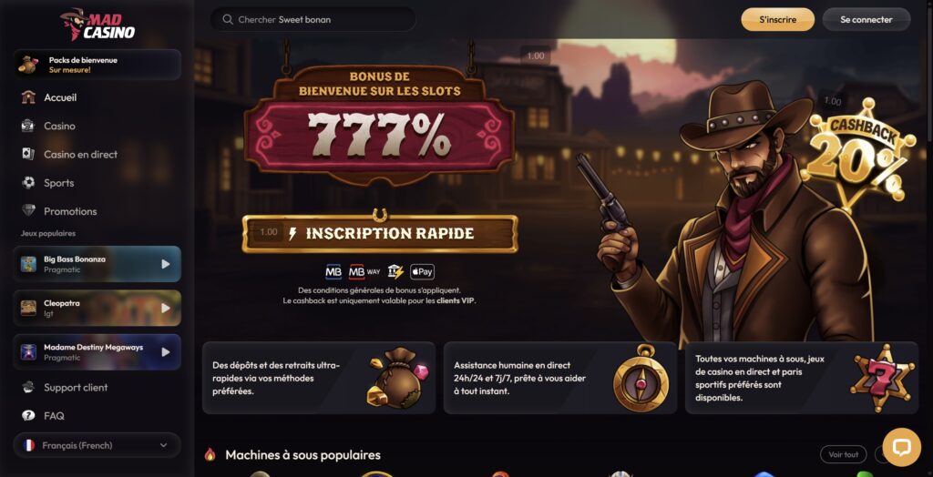 Mad Casino, lancé en 2025 sous licence d’Anjouan, propose un design moderne et un thème Wild West. Spécialisé dans les machines à sous et paris sportifs, il supporte 16 cryptomonnaies et des dépôts en EUR/CAD.